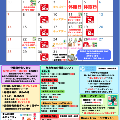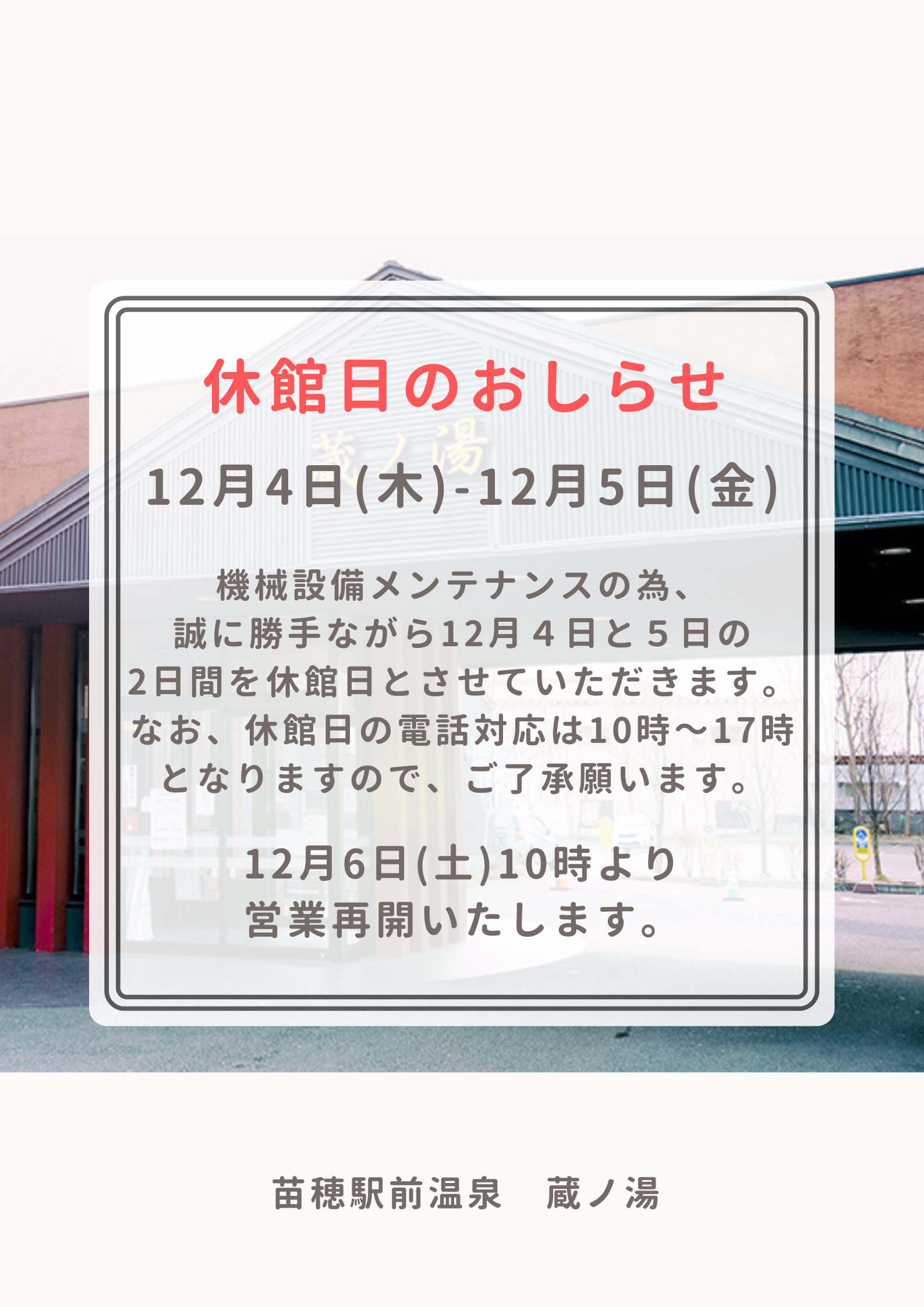 2025.11.14 【休館日のおしらせ】 機械設備メンテナンスの為、誠に勝手ながら 12月4日(木)、12月5日(金)の2日間を休館日といたします。 12月6日(土)10時より営業再開いたします。 何卒、ご理解のほどお願いいたします。 Tweet Share 休館日